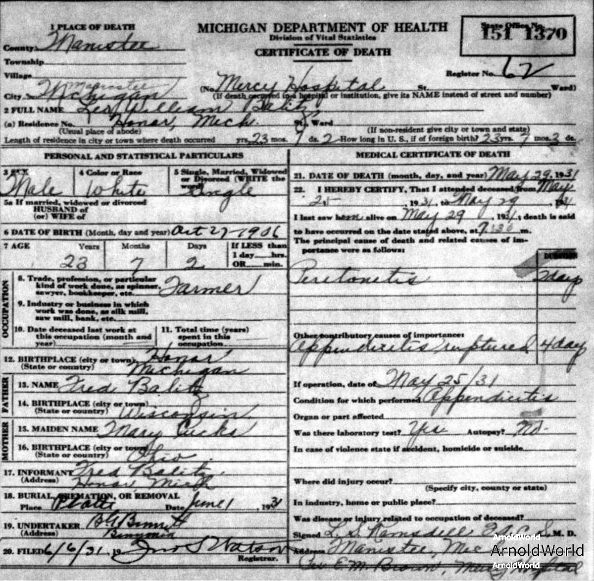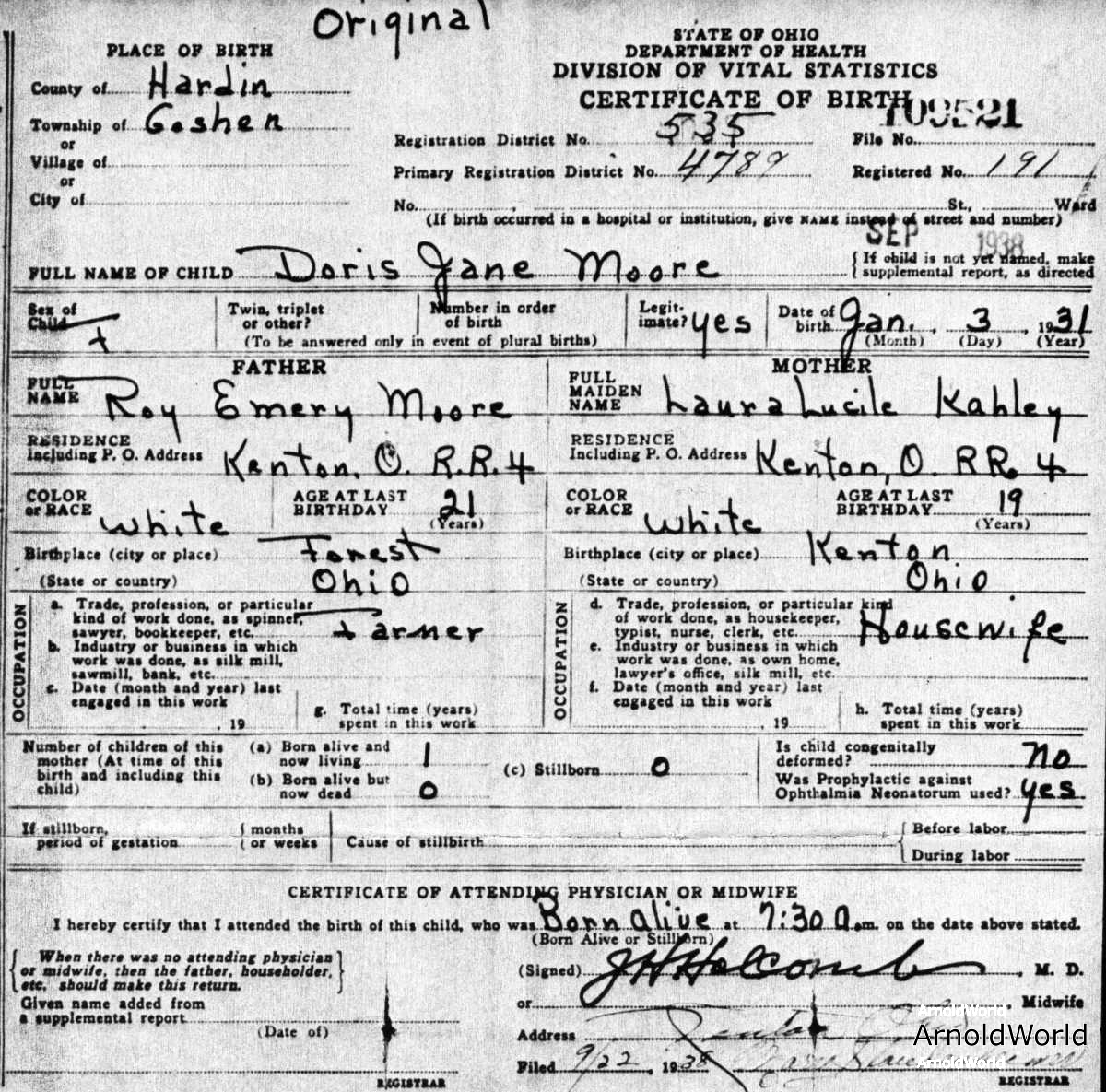 Doris was born in Kenton, Hardin, OH, USA on Saturday, January 3, 1931. Doris always said she was born in Kenton, but while her birth certificate says her parents both lived in Kenton, it also says Doris was born in Goshen township, just east of Pleasant township where most of Kenton is located.