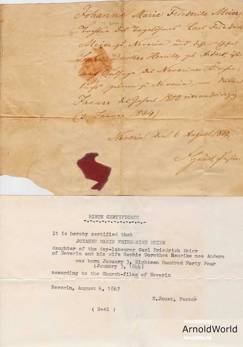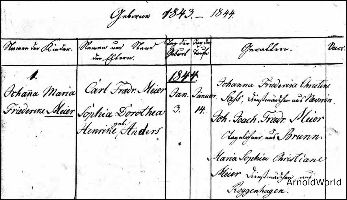 Johanne Marie Friederike Meier (Mary as she was later known as) was born to Carl Friedrich Meier and Sophie Dorothea Henrike Anders in Neverin, Mecklenburg-Strelitz, Mecklenburg-Vorpommern, Germany on Wednesday, January 3, 1844.